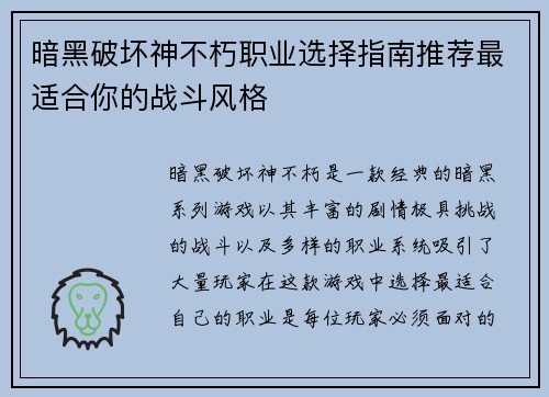 暗黑破坏神不朽职业选择指南推荐最适合你的战斗风格