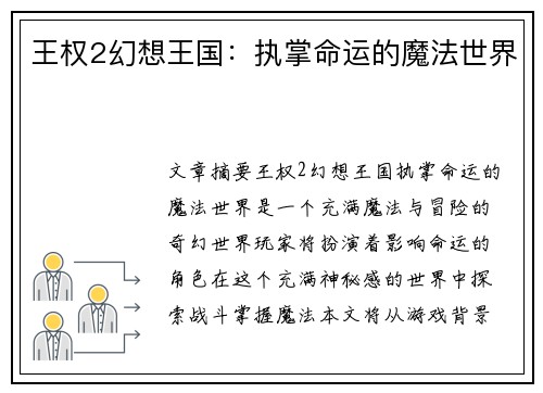 王权2幻想王国:执掌命运的魔法世界